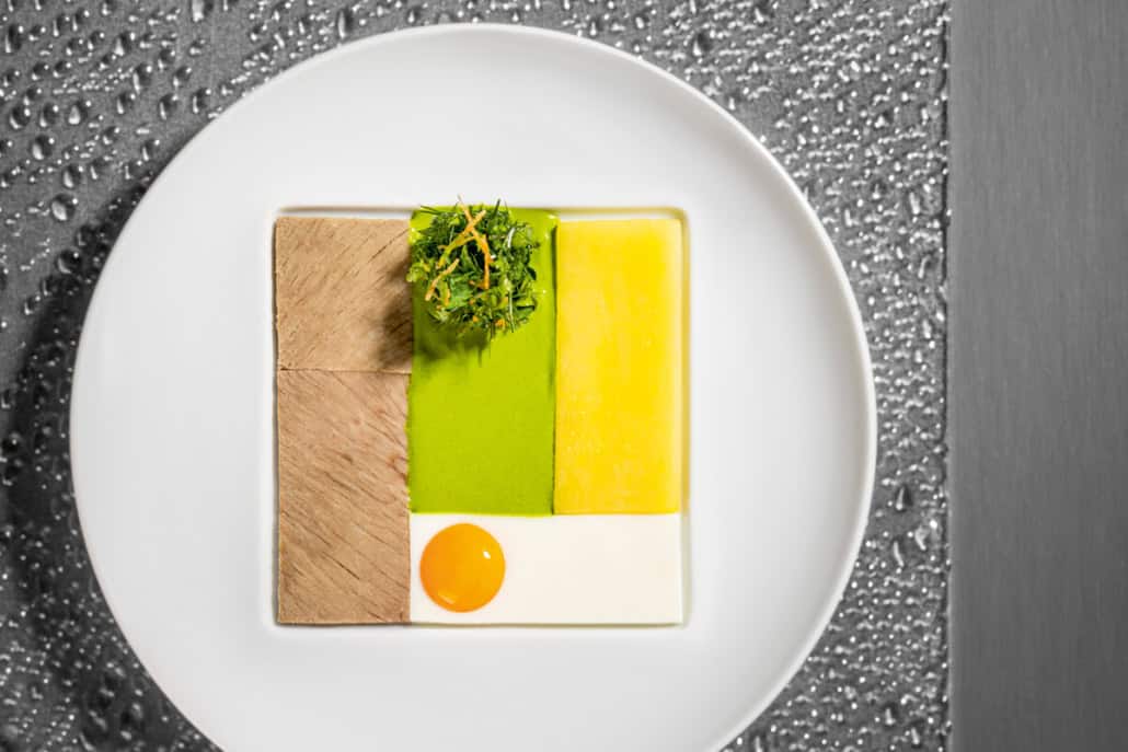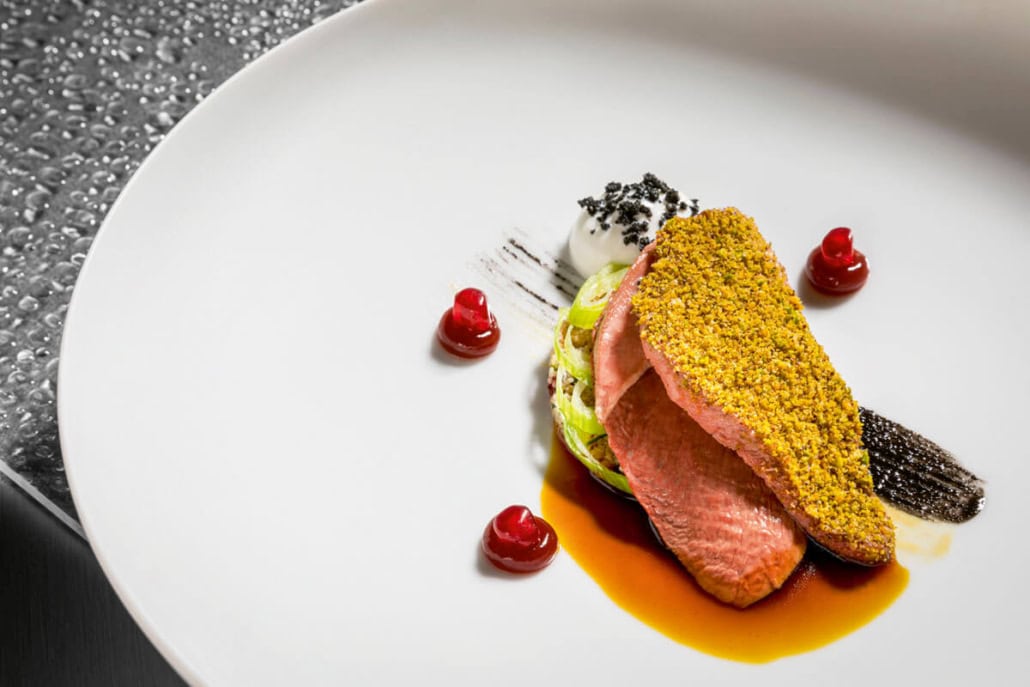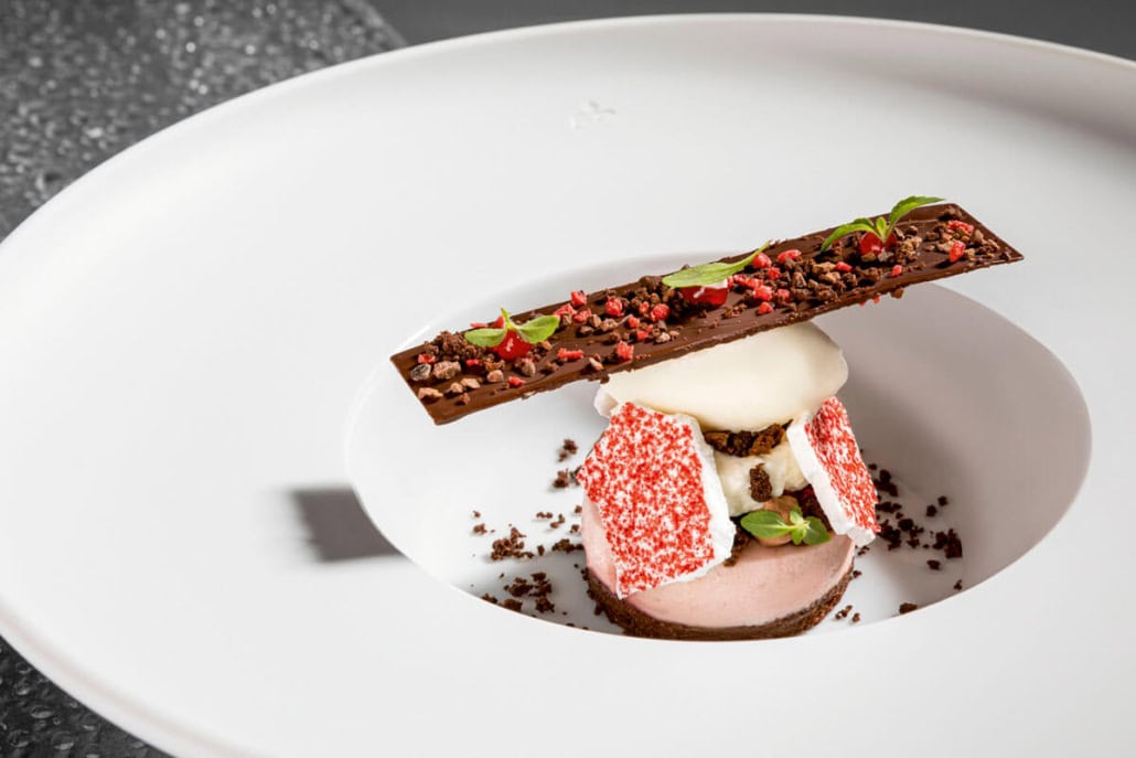 Häufig sind die Gerichte Sven Elverfelds von seinen kulinarischen Erin­nerungen geprägt. Somit erzählt jedes Menü eine geschmacklich vielseitige Geschichte mit ganz besonderem Charakter. Elverfelds Küche wurde oft als „Küche der Erinnerung“ beschrieben: Gerichte, die Vertrautes präzise neu denken und veredeln. Ikonen dieser Handschrift sind die Kalamata-Olive, inspiriert von seiner Zeit in Griechenland, die Taube Orientalisch mit Gewürzen aus Dubai, der von der Presse als Mondrian betitelte Tafelspitz sowie das ikonische Ruinart Rosé Crème Sorbet. Sie alle sind Gerichte und Geschichten, die bleiben.