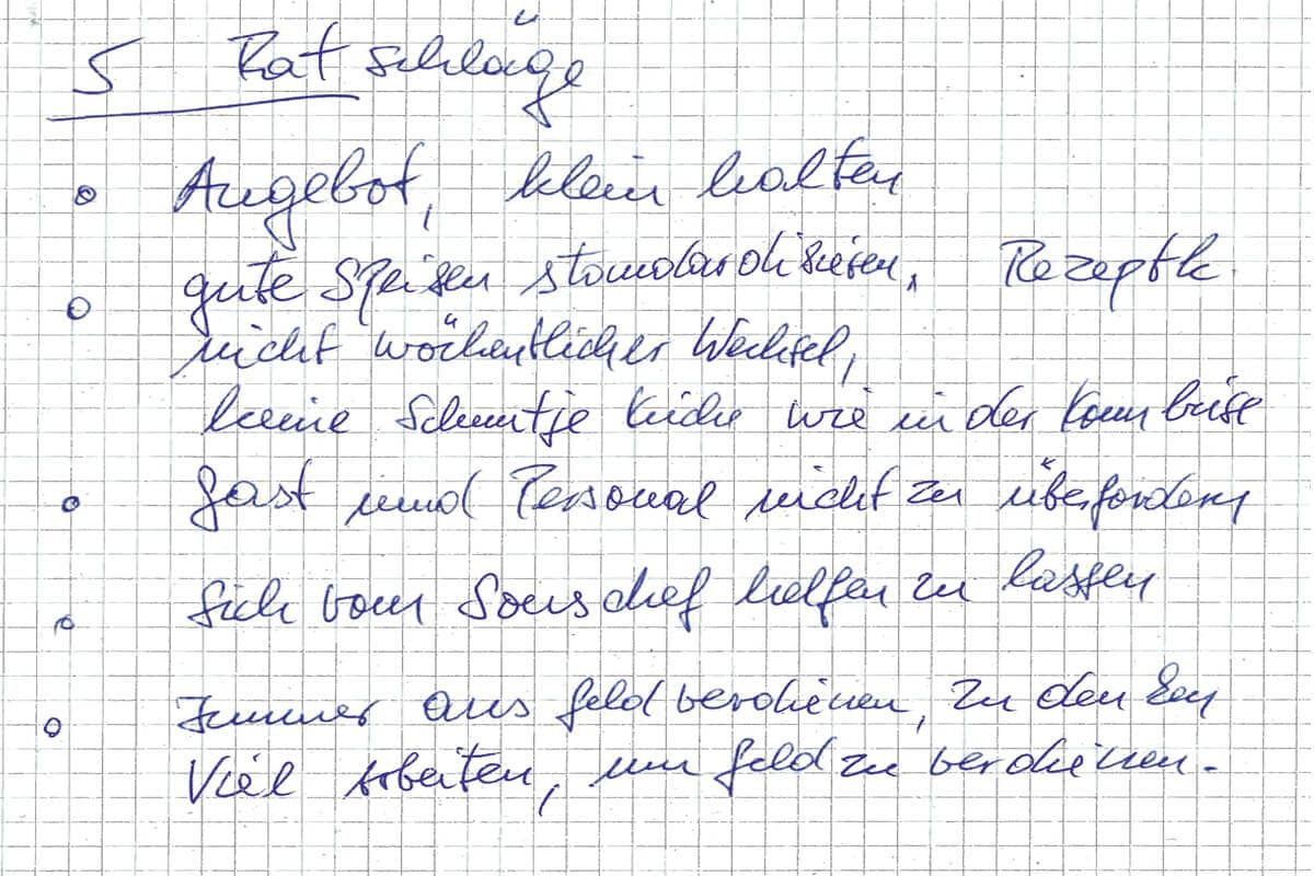 Block: 1. Halten Sie das Angebot überschaubar, damit sich die Kosten nicht in die Höhe schrauben. 2. Arbeiten Sie stets daran, gute und erfolgreiche Gerichte zu verbessern, zu standardisieren und zu rezeptieren, damit immer gleichmäßig gut gekocht wird! 3. Rütteln Sie nicht an den Löhnen! Hohe Löhne sind kein Grund für Verluste, sondern halten Mitarbeiter motiviert. Nehmen Sie Mitarbeitende und ihre Bedürfnisse ernst. Diese müssen mit ihrer Arbeit ihr Leben finanzieren können. 4. Arbeiten Sie konzeptionell und mit System – vermeiden Sie die Smutjeküche. Lassen Sie sich im Alltag von einem guten Sous Chef wie unserer Block Menü helfen! 5. Denken Sie immer ans Geldverdienen, Arbeiten muss sich lohnen, aber übertreiben Sie es nicht mit den Preisen. Ein gutes Restaurant ist nie ein Preistreiber!