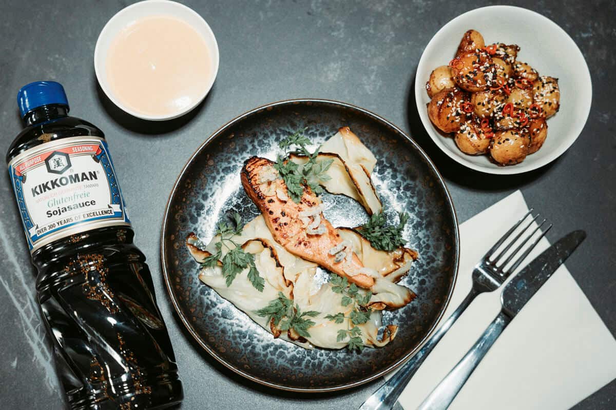 Kohl halbieren, auf den Schnittflächen in Butter und Sesamöl anrösten. Mit Apfelessig und Kikkoman glutenfreier Sojasauce ablöschen, weich schmoren.