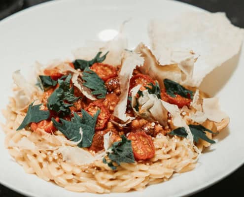 - Zwischendurch mehrfach umrühren. Wenn die Sauce zu dick wird weiteres Wasser (ca. 125 ml) einrühren. Mit geraspeltem Käse bestreut servieren.